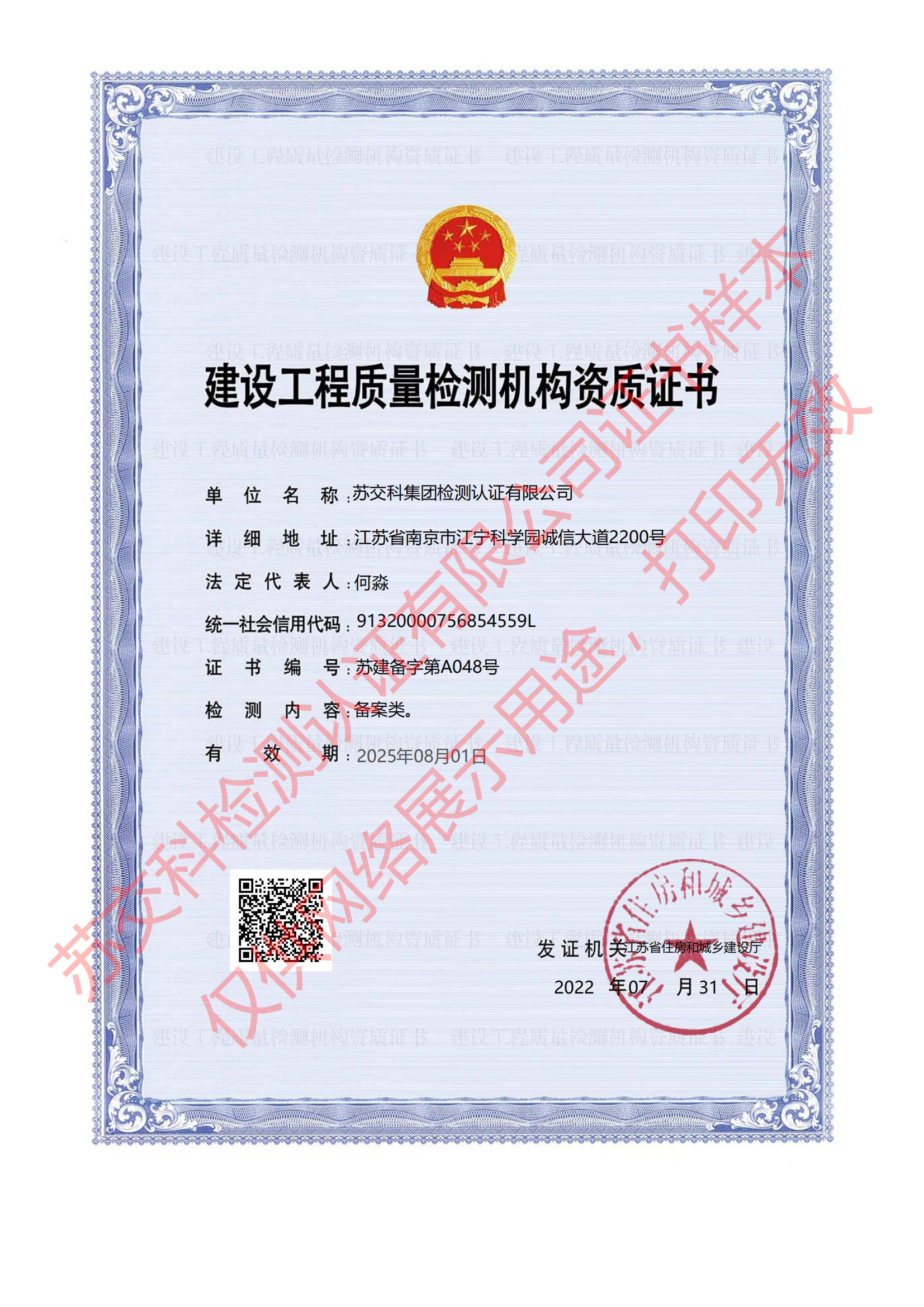 蘇交科檢測認(rèn)證建設(shè)工程質(zhì)量檢測機構(gòu)資質(zhì)證書(備案類)